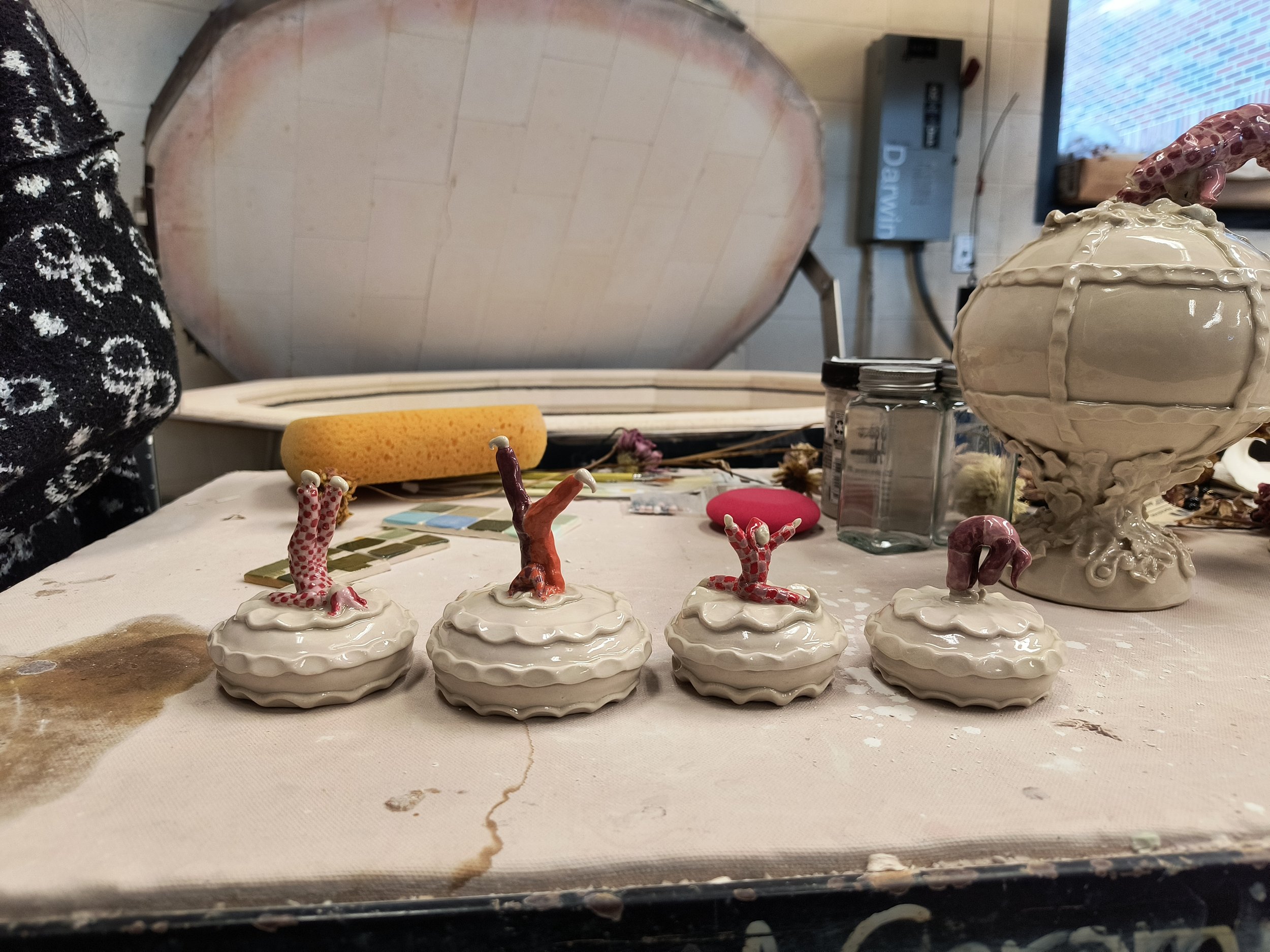 On all of them, glaze fused the lids onto the vessels. I was able to pop off the lid of the orange fool, but it got chipped on one side (still photographable tho which it important). I was also able to pop apart the little ones but all but one chipped badly and are un-photographable and in essence a little bit ruined.